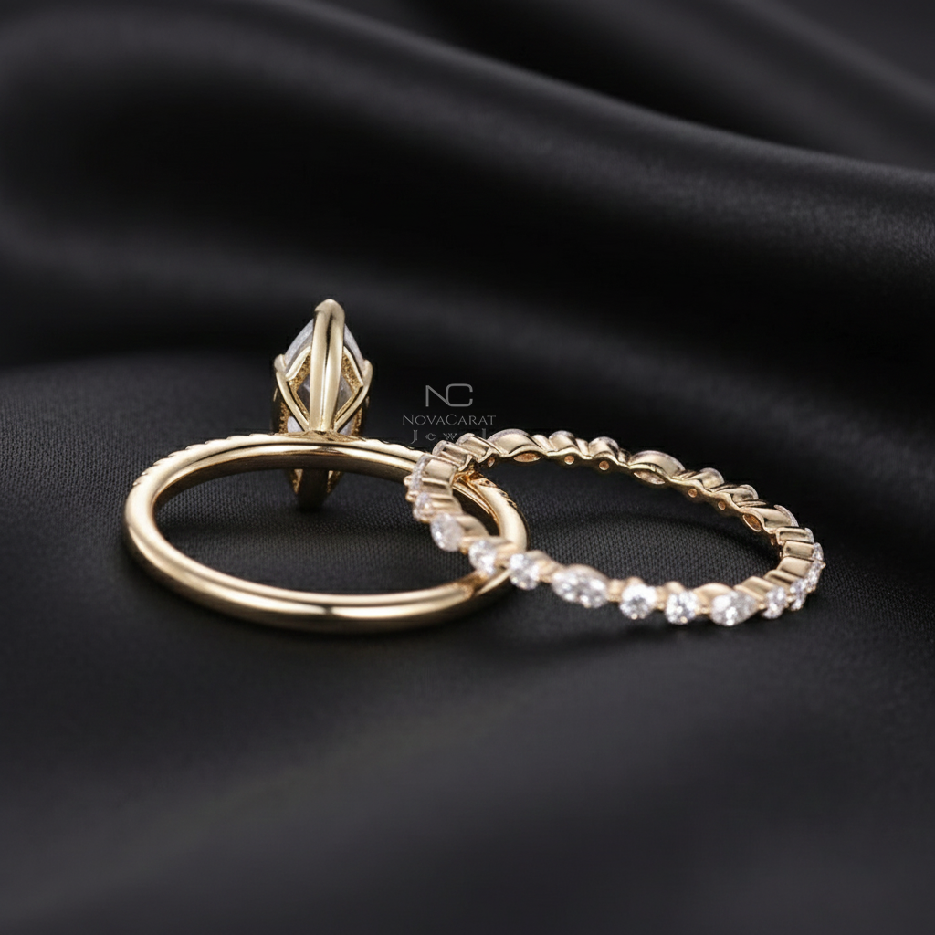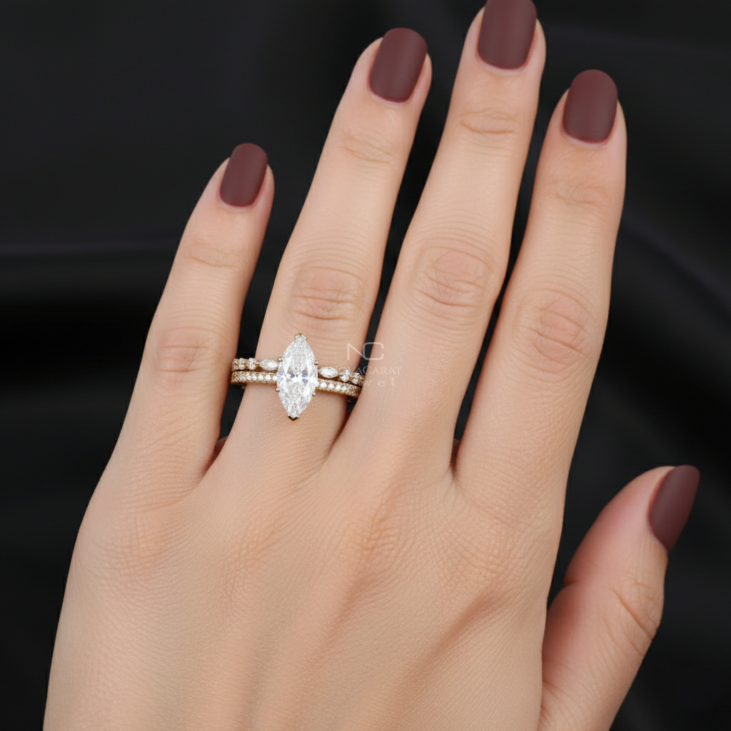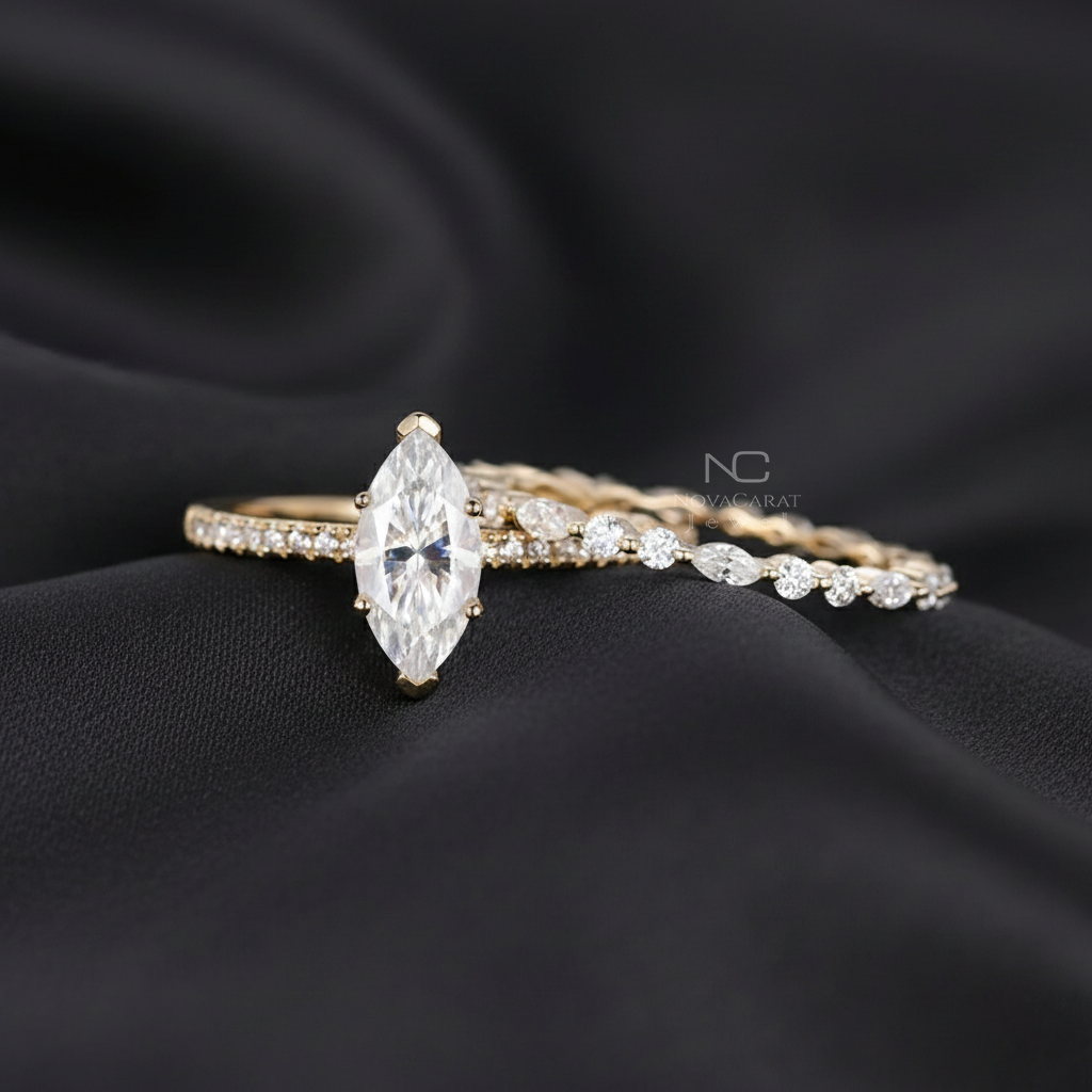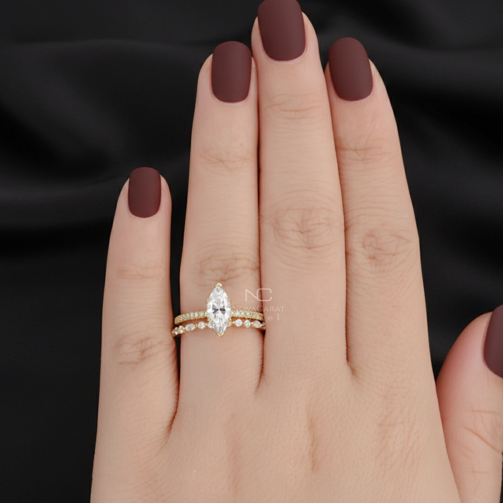 1.0 CT Marquise Cut Solitaire Pave Moissanite Bridal Ring Set, Solitaire Engagement Ring Set for Women, Solid Gold Bridal Ring Set for Her