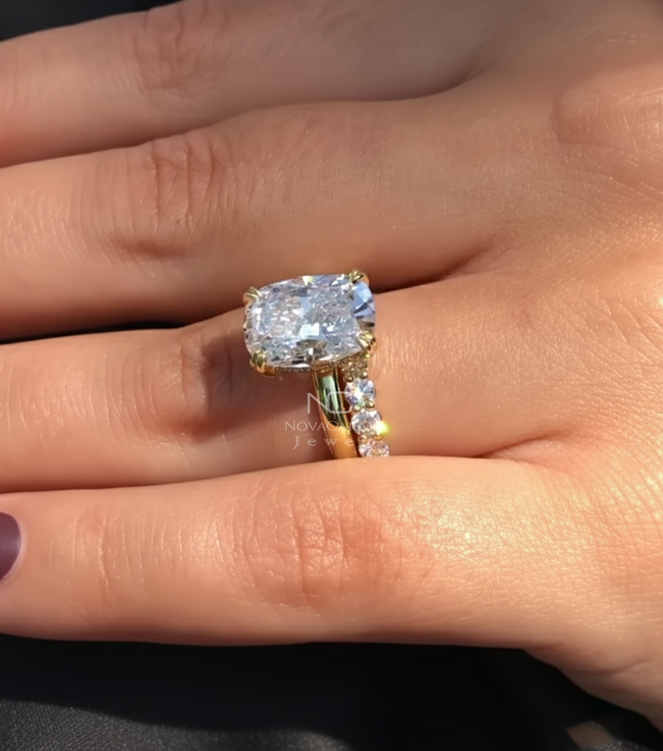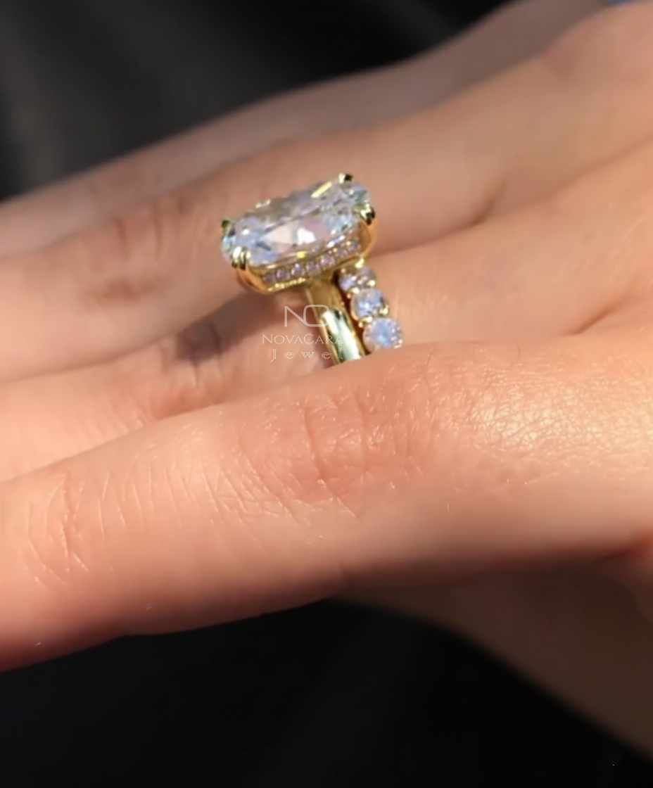 Unique Cushion Cut Moissanite Engagement Ring Set Solid Gold Ring Elongated Bridal Set Cluster Wedding Ring Set Women Promise Anniversary