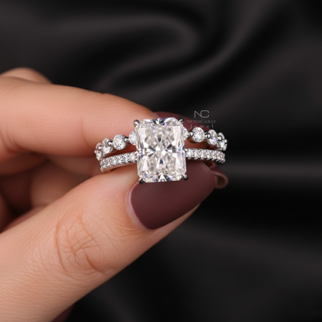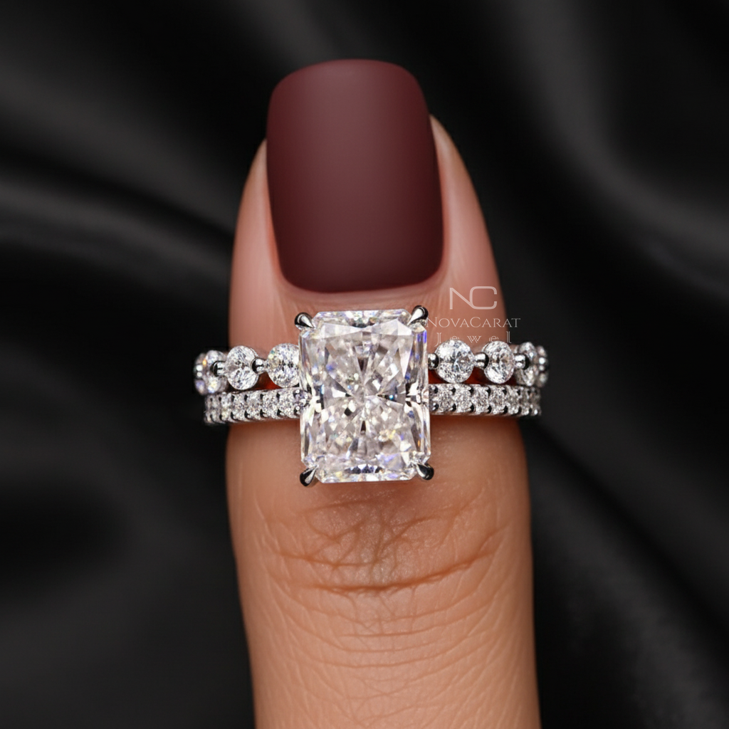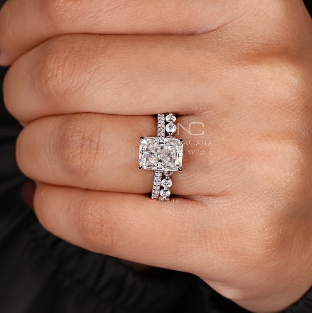Radiant Moissanite Ring With Eternity Wedding Band, Hidden Halo Diamond bridal anniversary Set, Perfect Gift for Her.