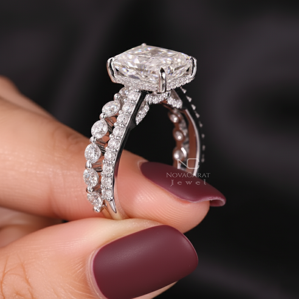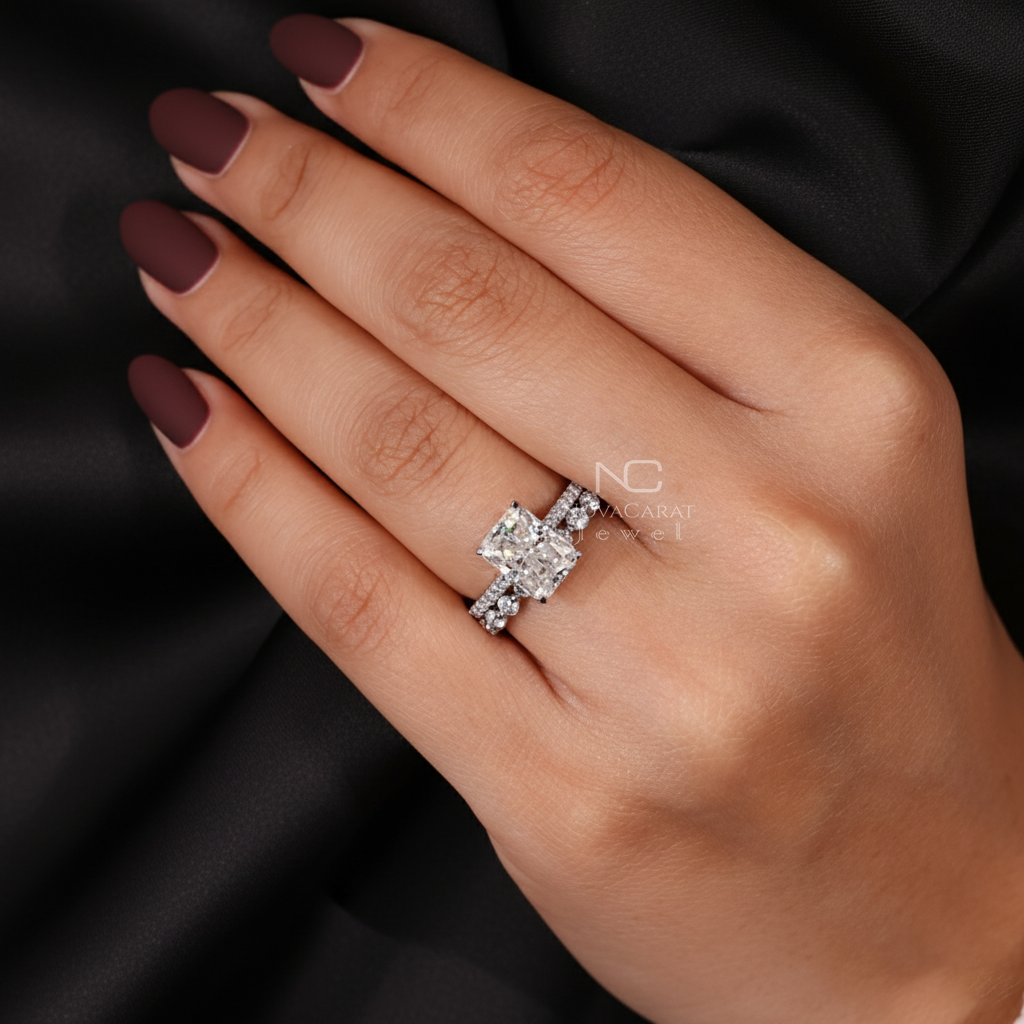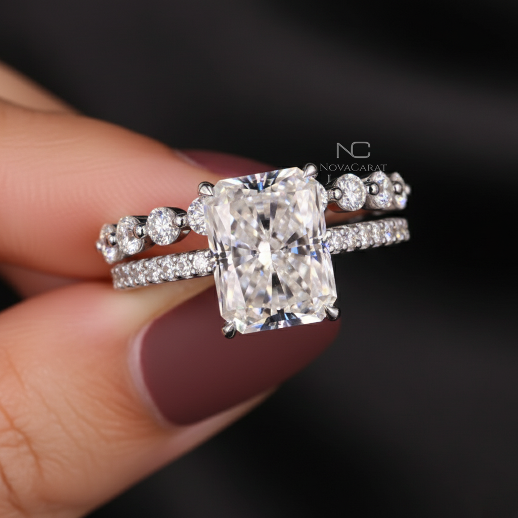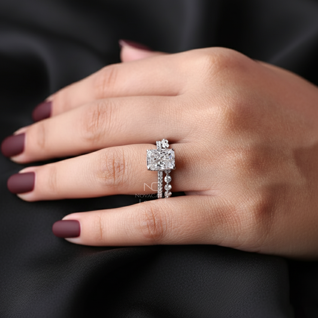 Radiant Moissanite Ring With Eternity Wedding Band, Hidden Halo Diamond bridal anniversary Set, Perfect Gift for Her.