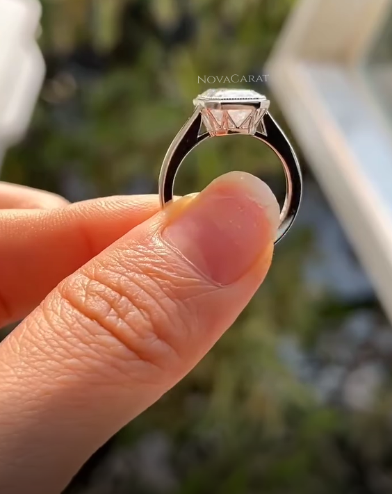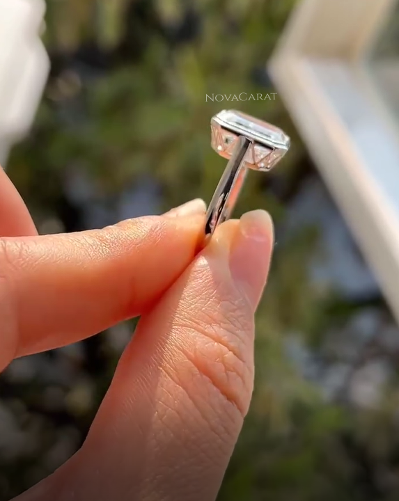 this emerald cut moissanite ring features a classic bezel setting that gives it a modern, clean look while offering maximum protection for the stone, Bridal Promise Ring, Handmade Ring For Women, Customized Diamond Ring,